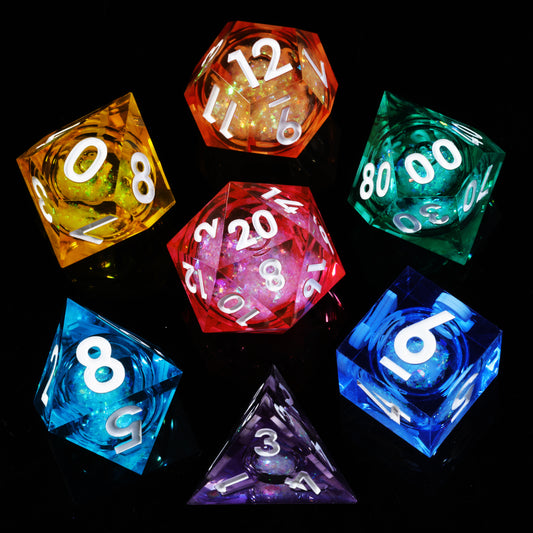 Liquid Core Rainbow Handmade Sharp Edge 7 Piece Resin d&d Dungeons and Dragons Dice Set